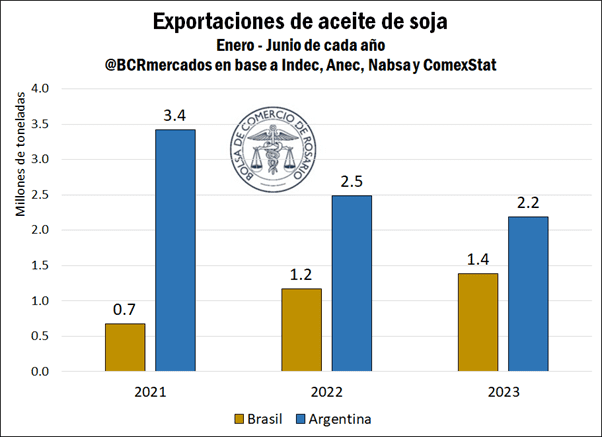Con relación al aceite de soja, el volumen de exportaciones argentinas también se ubica por debajo del año pasado. Sin embargo, el recorte se acerca al 12%, un nivel menor que las bajas experimentadas por la harina de soja. Por su parte, Brasil duplica el acumulado de exportaciones que tenía hace apenas dos años. En ese entonces, las exportaciones argentinas de aceite superaban en más de un 400% a las brasileras, mientras que actualmente Argentina se ubica un 57% por encima del Brasil.