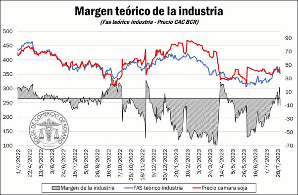 En este complejo contexto productivo, el precio FOB de la harina de soja del Up River creció un 25% desde los mínimos de principios de junio. Por su parte, el aceite subió cerca de un 20% en este mismo período. Esto mejoró la ecuación de la industria, a la hora de analizar su margen teórico aunque, lamentablemente, la virtual paralización de las operaciones imposibilita aprovechar este resultado.