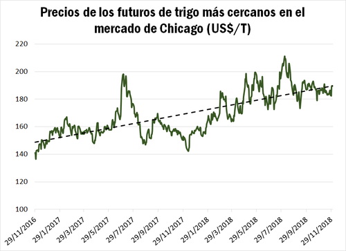 En relación al mercado de trigo, la FAO proyecta que en la campaña comercial 2018/19 la hoja de balance mundial se presentará más ajustada que en la campaña anterior. Esta situación ya comienza a manifestarse en los precios internacionales, tomando como referencia al mercado de Chicago, se observa que las cotizaciones de los futuros más cercanos de trigo son mayores a las del año pasado a la misma altura. También es más elevada que hace dos años atrás.