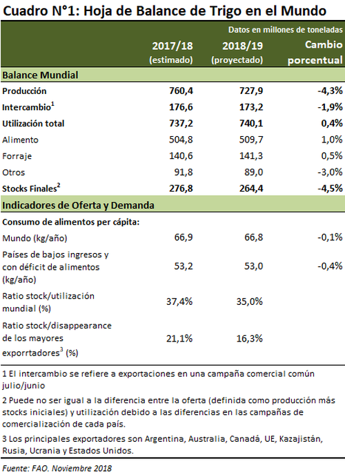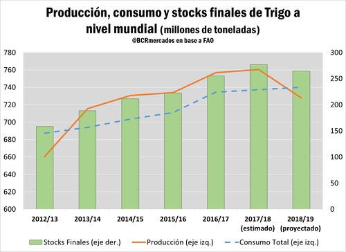 Por la merma productiva y un aumento del consumo total, los stocks finales mundiales de trigo en 2018/19 caerían por primera vez en cinco años. La situación es similar para los cereales gruesos. Se espera que la escasez relativa de oferta en relación a la demanda brinde sostén a los precios.