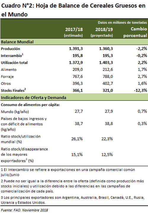 La FAO espera que la producción de cereales gruesos (incluye maíz, cebada, sorgo, mijo, centeno, avena y otros no especificados) muestre en el año 2018 una contracción de 2,2% en relación al año anterior, principalmente como resultado de condiciones climáticas adversas en varios países productores de maíz, y también por una notable reducción en la producción mundial de cebada, que caería a un mínimo de seis años. Pese a esto, las estimaciones han mejorado respecto al informe de la FAO de julio, por un clima en general favorable a los distintos cereales a lo largo de Asia y de los Estados Unidos.