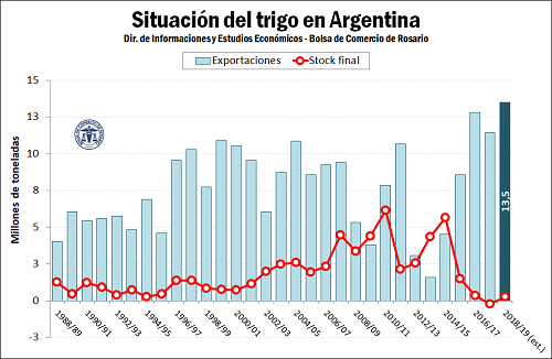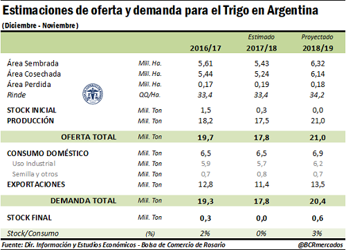 Como surge de la tabla, el principal escollo que le queda al trigo en Argentina es llegar a la campaña próxima. La caída en la producción como consecuencia de los excesos hídricos del invierno pasado se enfrentó con una demanda muy activa en la actual campaña 2017/18, que exprimiría el nivel de inventarios en Argentina.