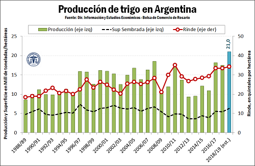 Si bien se confirma un mercado tirante para el empalme de campañas de trigo, el nuevo ciclo dará revancha. El sector productivo argentino se encamina a obtener una cosecha récord de trigo para el 2018/19, sobre la base de una superficie estimada en 6,32 M ha. Con rindes tendenciales, ello facilitaría una producción de 21 Mt, habilitando una nueva marca histórica para las exportaciones del grano.