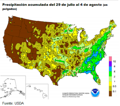 Para EE.UU., la consultora Lanworth recortó su proyección de producción para la campaña 2018/19 a 50,5 Mt, un 1% por debajo de lo estimado el mes pasado. Esta merma responde a las condiciones desfavorables en el norte de las Planicies estadounidenses a fines de la temporada del trigo de primavera, que termina de llenar sus granos en con bajo nivel de reserva de agua en suelo por el regreso del clima seco desde fines de julio. Ese clima seco ha estado contrarrestando los efectos benéficos de las lluvias que se habían desarrollado a principios de ese mismo mes de julio. En tanto, la sequedad ha permitido que la cosecha de trigo de invierno esté llegando a su fin por delante del ritmo habitual, a excepción de unas pocas zonas en la región occidental. El siguiente mapa del Departamento de Agricultura de los Estados Unidos muestra la escasez de precipitaciones en la semana comprendida entre el 29 de julio y el 04 de agosto.