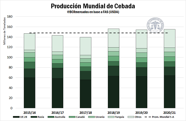 Los principales países o bloques que traccionarán la producción de cebada en la nueva campaña son la Unión Europea, Rusia, Australia, Canadá, Ucrania y Turquía, seguidos de cerca por Kazajastán, Irán y Argentina. La producción crecería en términos interanuales en la Unión Europea (pasaría de 63 a 64,1 Mt), Australia (9 a 10,2 Mt) y Turquía (7,9 a 8,4 Mt), dándose la mayor recuperación en el primero de estos países, gracias a las buenas condiciones climáticas tras tres años consecutivos de sequía, lo que permitiría que la cosecha alcance su mayor volumen en cuatro años. Por otra parte, las producciones de Rusia (19,94 a 17,3 Mt) y Canadá (10,38 a 9,7 Mt) serían inferiores a las del ciclo vigente, pero estarían en niveles cercanos a los promedios que tuvieron estos países en los últimos años. En la Unión Europea, la producción fue ajustada de mayo a junio, pasando la cifra a 64,1 Mt, gracias a las lluvias de mayo que brindaron alivio y llevaron el agua necesaria luego de un pulso seco prolongado. Estaría 1,7% por sobre la campaña actual y 7% superior al promedio de los últimos cinco ciclos.