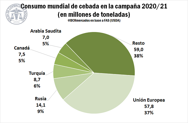 Los mayores consumidores de cebada son la Unión Europea, Rusia, Turquía y Canadá. Su consumo combinado sería de 88,1 Mt, un millón más en relación con el ciclo actual 2019/20. El FAS, por otra parte, proyecta que mientras aumentaría el consumo en la UE y Turquía, decrecería en Rusia y Canadá.