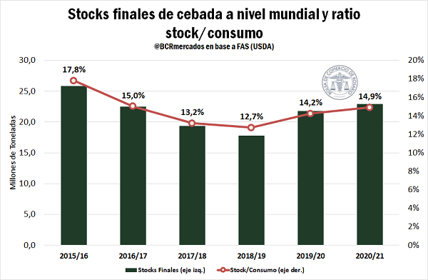 El FAS prevé que habría un decrecimiento en el comercio internacional debido a una menor demanda de importación de China, apenas compensada por el aumento que experimentarían las importaciones de Arabia Saudita y Tailandia. Las importaciones globales, proyectadas en 24,6 Mt, serían 3,8% inferiores a las del ciclo actual, y 7,6% menores al promedio de las últimas cinco campañas. En general, la caída en el comercio viene asociada a las bajas cotizaciones del maíz, que puede sustituir a la cebada en la alimentación animal. También influye la caída de la actividad en el rubro de la cerveza ante el cierre de bares, restaurantes y lugares de esparcimiento, la cancelación de eventos masivos y la reducción del turismo. Se espera que los patrones comerciales puedan seguir experimentando modificaciones o interrupciones parciales en función de cómo evolucione la pandemia mundial de COVID-19.