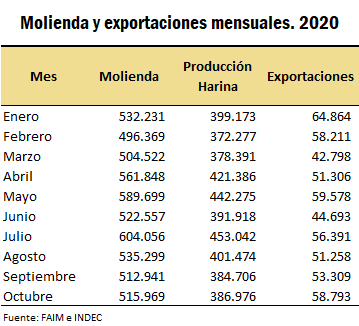 En lo que respecta al año 2020, los datos de la FAIM relativos a la molienda de trigo pan y candeal en la República Argentina para el año muestran que la misma ascendió a 5,4 millones de toneladas hasta el mes de octubre. El primero es el que se muele para obtener harina de trigo que se utiliza en la panificación, en tanto que el trigo candeal se muele para fabricar fideos, ya que, a diferencia de los elaborados con harina de trigo para pan, éstos tienen la característica de ‘no pegarse’. A lo largo del año, julio fue el mes de mayor molienda con casi 604.000 toneladas, esto muestra que, a diferencia de la actividad exportadora, la molienda no muestra una estacionalidad tan marcada al inicio de la campaña comercial de trigo.