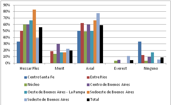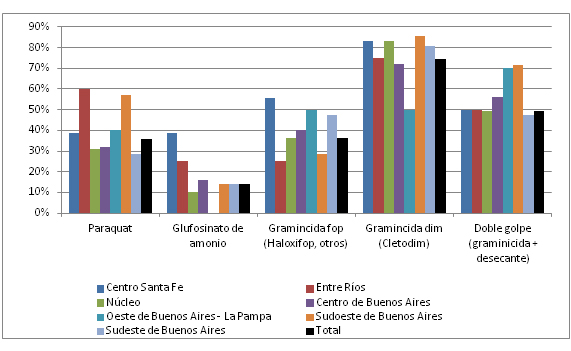 Si no se aplican residuales y el control se hace tardíamente, con plantas de más de 10-15 macollos, pueden producirse rebrotes luego de la aplicación solo de graminicidas, por lo que se recomienda la técnica del doble golpe, haciendo una segunda aplicación con un desecante como paraquat o glufosinato, luego de una primera aplicación con graminicida. En la Figura 3 se pueden observar los tratamientos más utilizados en cada zona para el control de plantas nacidas en los barbechos, según una encuesta realizada por REM en 2018.