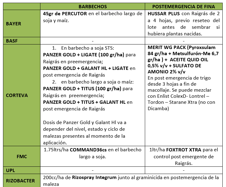 Existen diferentes herramientas para el control residual de Raigrás en los barbechos. En el 2018 se probaron en Cerrito, Entre Ríos, 14 alternativas de 6 sitios de acción distintos. Se evaluaron muy buenos resultados de control con el grupo de inhibidores de ALS e inhibidores de pigmentos. No obstante también fue satisfactorio el control con atrazina+metolaclor, trifluralina y flumioxazin, tratándose de sitios de acción todos diferentes entre sí.
