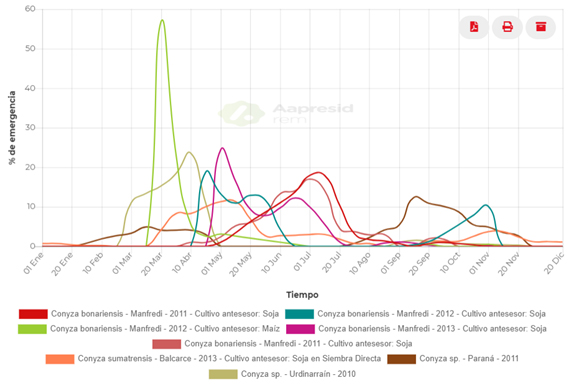 Conyza es muy sensible al entierro de sus semilla a escasos centímetros del suelo (1-2cm). Es muy sensible al sombreo, por lo que su nacimiento y crecimiento posterior es fuertemente afectado por un cultivo de invierno, de renta o de servicio, con buen desarrollo.
