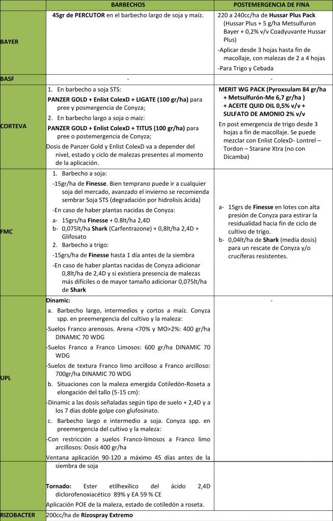 Cuando en el barbecho se quiera controlar Conyza y Lolium nacidos, surge la opción de mezclar graminicidas con hormonales. Si las malezas son pequeñas no se va a observar antagonismo, pero si son de mayor tamaño se verificará una menor performance a la esperada en Lolium. Las opciones son: separar las aplicaciones, subir la dosis de graminicida o utilizar hormonales con menor antagonismo como fluroxipir, clopiralid o picloram, siendo los peores 2,4D y dicamba.