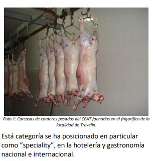 En Patagonia la oferta de carne ovina es estrictamente estacional y está limitada a “corderos livianos” de destete de aproximadamente 20 kg de peso vivo y a animales adultos. En general los mercados actuales y la oferta de la carne ovina son muy inestables y están condicionados a las condiciones climáticas. Años con adecuadas precipitaciones muestran un incremento en las señaladas y oferta de corderos, mientras que en años secos las señaladas son bajas y la oferta de corderos disminuye. En la actualidad existe otra categoría de cordero denominada “cordero pesado” que es un animal diente de leche que pesa más de 30 kg de peso vivo y más de 13,1 kg de carcasa (Foto 1).