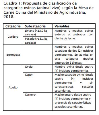 La clasificación de animales y tipificación de carcasas tiene como fin agrupar por características similares. De esta manera, se promueve la confianza del mercado por los patrones de calidad a nivel de la producción primaria, industria, comercio y consumidores. A su vez, permite determinar los valores comerciales de cada tipo de animal o carcasa, traduciéndose en términos económicos y de la demanda. Actualmente en Argentina se está trabajando en el desarrollo de un sistema nacional de clasificación (cuadro 1) y tipificación de la carne ovina.