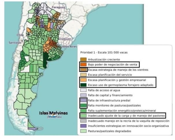 Este informe se limitará en las limitantes identificadas en establecimientos de cría de 101 a 500 vacas, que concentran 33% de las existencias de vacas del país. En el gráfico se observan las limitantes identificadas como principales en las diferentes zonas productivas del país. Considerando que entre Buenos Aires y Santa Fe se concentra 47% de la existencia de vacas del país, en estas dos provincias, las limitantes más sobresalientes mencionadas son inadecuado ajuste de carga y manejo de pastoreo, escasa planificación y gestión empresarial, escaso uso de germoplasma forrajero adaptado y bajo poder de negociación de ventas. Hay otras limitantes, como la falta de infraestructura, manejo de vientres y monitoreo de pasturas, pero en menor superficie identificado como prioridad.