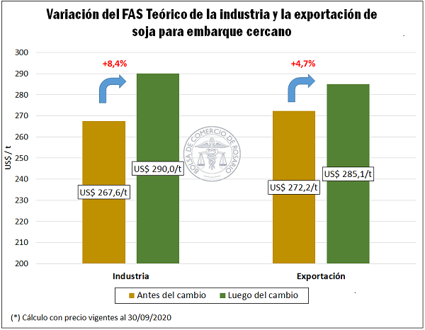 Finalmente, el día jueves 1° de octubre el Ministro de Economía Martín Guzmán anunció, entre otras medidas económicas, una modificación en el esquema de derechos de exportación sobre el complejo sojero. Se reducirán las alícuotas de granos de soja del 33 al 30% en octubre, 31,5% en noviembre y 32% en diciembre, volviendo al 33% para el mes de enero en adelante; mientras que los subproductos tendrán una alícuota del 28% en octubre, subiendo al 29,5% en noviembre, 30% en diciembre y 31% de enero en adelante. Para el aceite de soja fraccionado, la alícuota queda un punto porcentual por debajo del aceite en bruto en tanto que al biodiesel, en principio, le corresponde una alícuota del 26% en octubre, que convergirá al 29% en el 2021. Estas medidas no han sido oficializadas al momento en el Boletín Oficial por lo que las especificaciones surgen de la información puesta a disposición en la conferencia de prensa del mismo jueves.