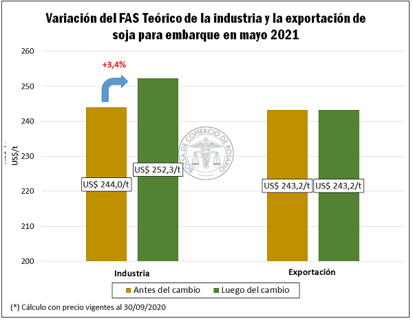 En ambos casos, el resultado de las nuevas medidas implica una mejora en la capacidad de pago del sector exportador en el mercado interno. Esto repercute en una mejora en el precio en el mercado interno, que comenzó a sentirse incluso antes de la oficialización de la medida. El día jueves, la posición más cercana en el Mercado Matba-Rofex cerró con una variación positiva de US$ 11/t (+3,74%), mientras los futuros en Chicago ajustaron prácticamente sin cambios, anticipándose a las nuevas disposiciones.