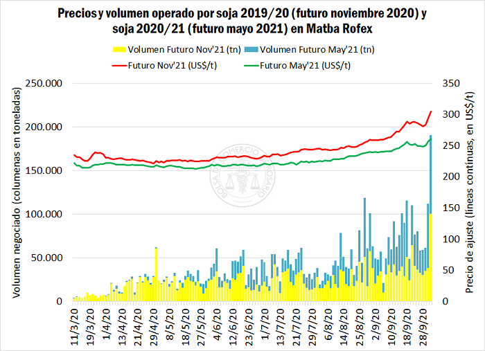 La misma dinámica se observa en Matba Rofex, donde los futuros con vencimiento en noviembre ajustaron a US$ 305/t la tarde del jueves, registrando el mayor volumen diario operado de la vida del contrato, con 100.500 toneladas. El futuro mayo 2021, en tanto, ajustó el 1ro de octubre a US$ 260,3/t operándose en el día 90.100 toneladas, nuevamente, el volumen más alto en la vida del contrato. El valor queda muy cerca de los US$ 261/t que valía la soja nueva en octubre de 2018, el valor más alto de la soja nueva desde el 2014 para esta altura del año.