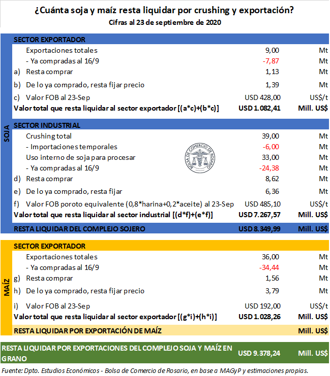Se estima, en base a la información de compras del sector industrial y exportador que publica MAGyP, que al 23 de septiembre restaban por liquidar de la campaña actual US$ 8.350 millones para el complejo soja más otros US$ 1.030 millones por exportaciones de maíz en grano, totalizando US$ 9.380 millones. Para arribar a este resultado, del uso proyectado de grano doméstico para industrialización en el caso de la soja y exportación de grano sin procesar tanto de soja como de maíz se le detrae el volumen que ya ha sido comprado, y a lo que resta adquirir se lo valúa al precio FOB vigente el 1ro de octubre. Además, se suma el volumen de negocios que ha sido negociado bajo condición precio a fijar y a la fecha resta establecer el mismo. El cuadro a continuación expone el detalle de los cálculos.