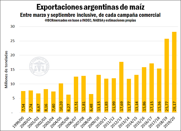 Siguiendo los datos de la agencia marítima NABSA S.A., los embarques de maíz del mes de septiembre habrían superado levemente las 2,8 millones de toneladas, un 14% por detrás del volumen despachado el mismo mes del año anterior, aunque aún es el segundo septiembre más alto de la historia. Con ello, el total de exportaciones en los primeros 7 meses de la campaña comercial 2019/20 asciende a 28,17 millones de toneladas, un récord histórico para los envíos exterior del grano en Argentina y un 11% arriba de lo embarcado entre marzo y septiembre del año anterior. Esta marca no deja de ser destacable, habida cuenta que con 37 Mt el año comercial 2018/19 resultó el de mejor performance para las exportaciones de maíz.