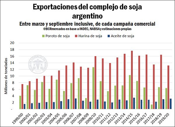 A contramarcha, la harina de soja registró embarques en el noveno mes del año por 1,97 millones de toneladas, el volumen más bajo de los últimos 8 años. El total en lo que va de la campaña 2019/20, con ello, queda en 13,18 millones de toneladas; en este caso, el volumen más bajo en más de una década.