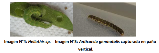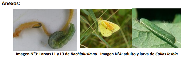 6- Las principales especies encontradas en cultivos de soja de la zona son, básicamente y como especie principal Rachiplusia nu conocida como “medidora” (Imagen N°3), seguida por Colias lesbia, reconocida por ser una larva no muy grande, típica de cultivos de alfalfa (Imagen N°4) y que se observan sus adultos en vuelos diurnos, de coloración amarillenta. Y en menor medida orugas o isocas bolillera (Heliothis sp.), (Imagen N° 5). También se registran en forma aisladas algunas Anticarsia genmatalis (Imagen N° 6).