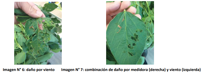 8- El cultivo de soja tolera altos niveles de defoliación más aun cuando las condiciones para su crecimiento son las que transcurrimos en la zona (Figura N°1). Los umbrales de daño rondan entre el 20% y 30% de defoliación según grupos de madurez, a partir de dichos valores se indica la aplicación de insecticidas para el control de defoliadora. En la zona se han registrado varias tormentas de viento, que han generado daños en cultivos (Imágenes 6 y 7), en las que se incluye soja, considerando que dicho daño debería estar sumado en este índice de defoliación.