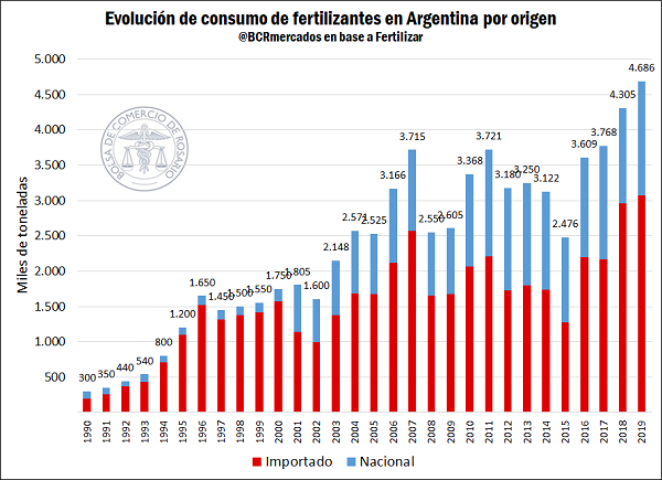 En este contexto y especialmente en las últimas tres décadas, el consumo de fertilizantes se incrementó más de 10 veces, pasando de 300 mil toneladas en el año 1990 a 4,6 millones toneladas en el año 2019, según información de la “Cámara de la Industria Argentina de Fertilizantes y Agroquímicos” (CIAFA). La importante expansión del área agrícola, la intensificación tecnológica en las técnicas productivas, sumada a la mayor producción relativa de trigo y maíz en las últimas campañas (el uso de fertilizante por hectárea implantada es mayor para estos cultivos), han producido un importante impacto en el mercado de fertilizantes, aumentando fuertemente la demanda, y con ésta, las importaciones de estos insumos indispensables para la actividad.