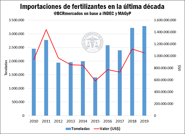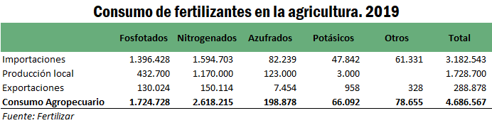 En el año 2019 se importaron 3,2 Mt de fertilizantes de distintos tipos, lo que representa casi un 68% de la utilización total. En total, las importaciones de fertilizantes demandaron divisas por US$ 1.050 millones.