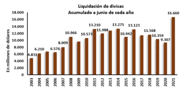 La liquidación de divisas entre enero y junio marcó un récord histórico, posicionándose un 25% por encima del récord anterior alcanzado en 2014 con u$s 13.275 millones.