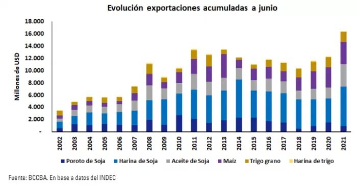 Cabe destacar que siete de cada diez dólares exportados en junio correspondió a productos primarios del sector agrícola o bienes agroindustriales, y entre ellos el 46% se explica por apenas tres cadenas, la sojera, la triguera y maicera.