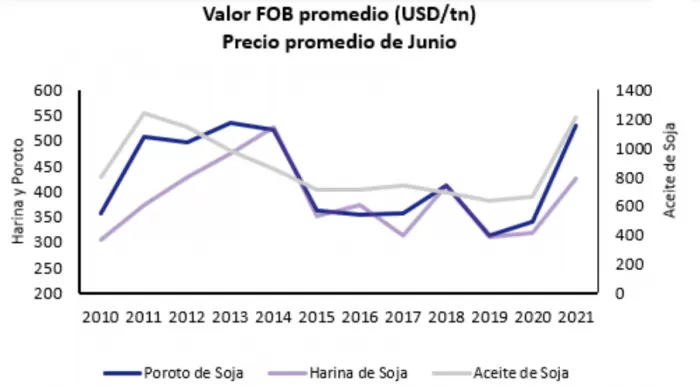 Pero la clave para entender el desempeño positivo en estos meses está en la evolución de los precios internacionales. Comparando junio de 2021 con el mismo mes de 2020 se observa un salto fenomenal en todo el complejo sojero. Mientras el poroto subió 55,4%, la harina lo lo hizo en orden al 33,4% y el aceite el 83,8%.