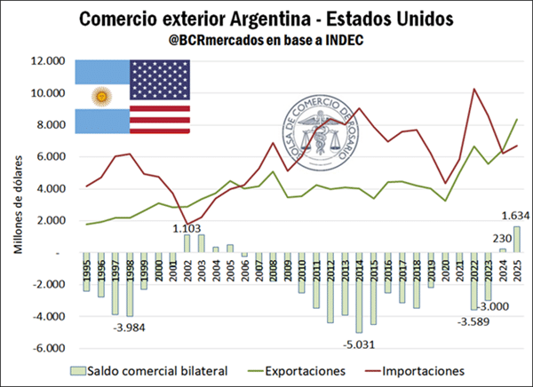 Además, el intercambio comercial bilateral fue el segundo más alto registrado, mientras que el superávit comercial con Estados Unidos alcanzó niveles récord. De esta manera, el país norteamericano se consolidó como el tercer destino de las exportaciones argentinas y tercer origen de importaciones, detrás de Brasil y China.