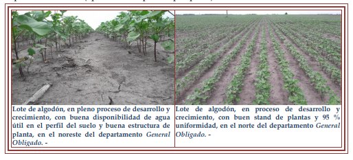 El desarrollo y crecimiento de los cultivares en la semana fue normal, sin inconvenientes. En algunos lotes puntuales la permanencia de agua en áreas Lote de arroz, con muy buena germinación, desarrollo, uniformidad y stand de plantas, con riego en el centro del departamento San Javier deprimidas, con encharcamientos fue disminuyendo y con ello la mortandad de plantas se detuvo. Las actividades fundamentales y prioritarias en la semana y futuros días, fueron y serían el monitoreo, el chequeo de los pimpollos en lotes donde comenzó la floración, a fin de la detección del daño. Ya que al comienzo de la misma, las trampas perdieron su atractivo para los picudos y en aquellos lotes en que todavía no comenzó dicho período, la observación de las trampas para la detección temprana de la plaga (picudo algodonero), debiendo realizarse aplicaciones en los bordes y en caso de necesidad en los lotes completos. La superficie sembrada para este ciclo se estimó en 59.800 ha, 1.200 ha menos que la intención de siembra que se presentó al inicio y 4.750 ha más que lo sembrado en el año anterior, para el logro de un aumento del 7,9 %. Se observaron los siguientes estados fenológicos: V “estados vegetativos” V1 (siembra a emergencia), V2 (emergencia), V3 (tercera hoja verdadera desplegada), V5 (quinta hoja verdadera despegada), V6 (sexta hoja verdadera despegada), V8 (octava hoja verdadera despegada), R “estados reproductivos” R1 (aparición del primer pimpollo) y lotes puntuales más avanzados en R2 (1º flor blanca-plena floración).