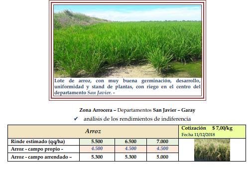 Las condiciones climáticas de la semana, fundamentalmente mayor cantidad de horas de sol, permitieron cambiar la irregularidad e inestabilidad que se registró desde mediados de noviembre hasta el 21 de diciembre, que no favorecieron en nada a los cultivares. Esta característica revirtió el contexto ambiental, dando leves mejorías al estado general del cultivo. El amarilleo de muchos lotes prosiguió manifestándose, circunstancia que iría cambiando debido a que las tareas de incorporación de nitrógeno que comenzaron a realizarse. La presencia de enfermedades secundarias en hojas, (helmintosporiun y cercospora), continuó observándose, beneficiadas por el período húmedo. Los cultivares se encontraron en los siguientes estados fenológicos: 3 – 4 hojas, macollaje, macollaje avanzado y principio de diferenciación. El valor comercial del grano de arroz con cáscara, fue de $ 7,00 /kg quedando igual a la semana anterior.