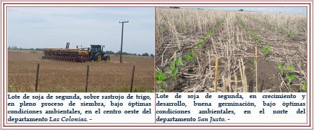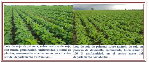 Las actividades de siembra se reanudaron y día tras día fueron retomando el ritmo a media que las condiciones del piso lo permitieron. En algunos sectores puntuales de la mayoría de los departamentos del área de estudio presentaron inconvenientes de emergencia de plántulas, por los excesos hídricos, contexto que mejoró y la germinación se normalizó. Se estimó una intención de siembra de unas 550.000 ha, con un incremento del 6,36 % representando unas 35.000 ha más, que la intención de la campaña pasada. Se observaron los siguientes estados fenológicos: V “estados vegetativos” VE (emergencia), Vc (estado de cotiledón, hojas unifoliadas pegadas), V1 (1º nudo), V2 (2º nudo) y lotes más avanzados en V3 (3º nudo).