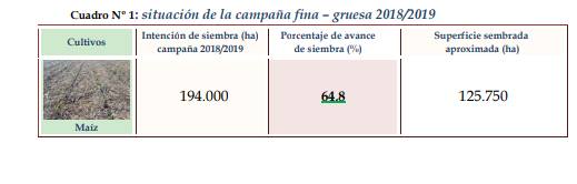 Hasta la fecha el cultivo de maíz presentó un avance en la siembra del 64,8 %, representando unas 125.750 ha. En un 47,3 %, unas 89.000 ha corresponden a los lotes sembrados en primera instancia, denominado maíz de primera, el cual de acuerdo al área de estudio tendría dos usos, un porcentaje a grano para futura venta comercial y el otro porcentaje como forraje, para consumo animal bovino y unas 36.750 ha a lo sembrado en segunda instancia, denominado maíz de segunda o tardío. Se reanudó el movimiento de sembradoras y de equipos en toda el área, con ello el proceso de siembra, tras los eventos climáticos que incidieron y detuvieron el mismo.