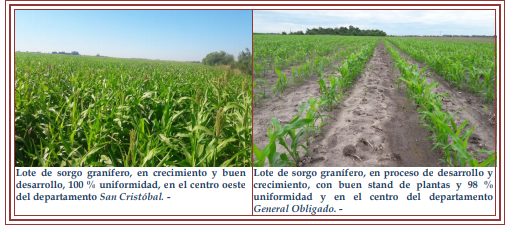 La buena a muy buena disponibilidad de agua útil en los suelos y las temperaturas adecuadas para el cultivo, hicieron que los cultivares comenzaran el período de estados reproductivos bajo óptimas e inmejorables condiciones como haces varias campañas no ocurría. Los cultivares en un 98 %, manisfestaron muy buen estado a excelente y el 2 % restante manifestó cierto grado de impacto por los diferentes eventos ocurridos en los distintos departamentos, como caída de piedras, fuertes ráfagas de viento y puntuales excesos hídricos. En cuanto al estado sanitario del cultivo se encontró muy bien, sin ataques de plagas ni enfermedades, hasta el momento. Con el transcurso de los días aumentarían las expectativas del sector, ante buenos a muy buenos rendimientos y calidad del producto. Se observaron, los siguientes estados fenológicos: V “estados vegetativos” V7 (7º hoja desarrollada), V8 (8º hoja desarrollada), V9 (9º hoja desarrollada), V10 (10º hoja desarrollada), Vt (panojamiento), R “estados reproductivos”, R1 (emergencia de estigma), R2 (cuaje – ampolla), R3 (grano lechoso), R4 (grano pastoso) y los más avanzados en un bajo porcentaje en R5 (grano dentado).
