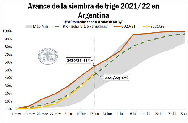 La siembra de trigo 2021/22 avanza a paso firme, acompañado por propicias condiciones climáticas. A diferencia de lo ocurrido un año atrás, cuando la falta de agua se imponía en gran parte del país y casi 200 mil hectáreas quedaron sin poder implantarse, este año la siembra arrancó con un fuerte impulso agroclimático. Las reservas actuales de humedad en el suelo se mantienen adecuadas, con algunas regiones muy puntuales que presentan un estado regular, pero que podrían resolverse con pocos milímetros.