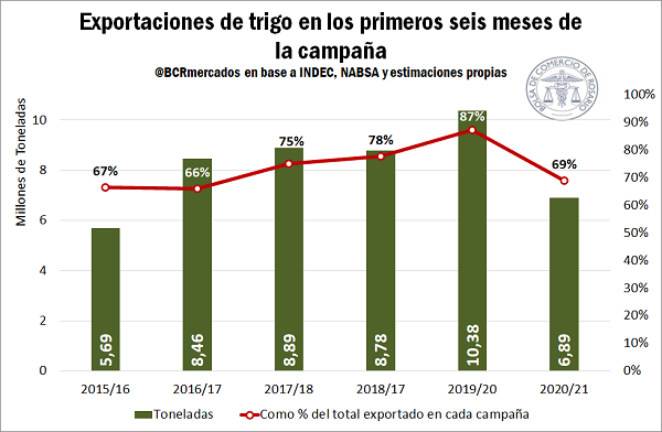 En lo que respecta al ciclo actual, en tanto, si bien ya se encuentran comprometidas para enviar al exterior 9,8 Mt de trigo de las 10 Mt proyectadas a exportar en la actual campaña 2020/21, las exportaciones efectivamente realizadas en los primeros seis meses de campaña alcanzan 6,9 Mt, el menor volumen desde el ciclo 2015/16. Parte de esto está explicado por la baja producción obtenida en la 2020/21 respecto de los ciclos previos, lo cual redujo la proyección de exportaciones. Pero, igualmente, el total de toneladas exportadas hasta el mes de junio representa el 69% del total de exportaciones proyectadas para el corriente ciclo. Esto se encuentra por debajo de lo alcanzado en los últimos tres ciclos comerciales.