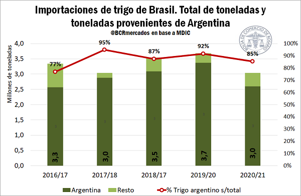 Por el otro lado, el segundo de los factores responde a las compras de trigo por parte de Brasil. Nuestro país vecino lleva importadas en total 3 Mt de trigo en los primeros seis meses de la campaña comercial, cuando a igual fecha del año anterior las importaciones totalizaban 3,6 Mt. Pero, además, la preponderancia de las importaciones de trigo argentino sobre el total importado por Brasil se ha visto disminuida en la actual campaña. De las 3 Mt importadas en el período actual, 2,5 Mt son provenientes de Argentina, un 85% del total. En el ciclo previo, en tanto, las de las 3,6 Mt que había importado aquel país, Argentina representaba el 92%, equivalente a 3,4 Mt. De todas maneras, a pesar de haberse reducido sobre el total, Argentina se mantiene como el proveedor indiscutido de trigo para Brasil.