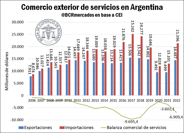 Apuntalar el turismo extranjero y estimular más exportaciones de servicios se hace fundamental para reducir el sustancial déficit comercial de servicios que tiene la República Argentina. El año pasado el superávit comercial de bienes totalizó los US$ 6.923 millones. Si incorporamos el déficit de servicios de US$ 6.910 millones, el superávit comercial total de 2022 se reduce a apenas US$ 14 millones.