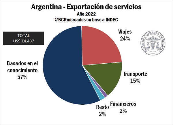 En el año 2022 Argentina exportó en servicios un total de US$ 14.487 millones, una variación interanual de 52%. Comparando con el promedio de los últimos 10 años, el crecimiento asciende al 9%. Asimismo, y por primera vez en cinco años, el comercio exterior de servicios recupera lugar en las exportaciones totales, representando el 14% de la canasta exportadora nacional en 2022, el segundo más alto luego el 21% que tocó en 2017.