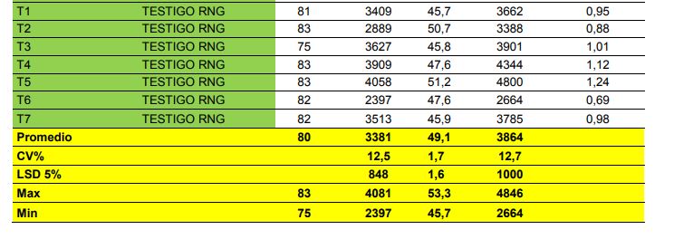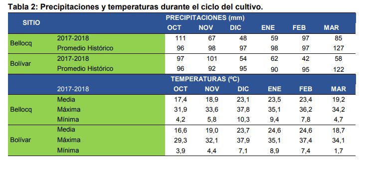 Se evaluaron en ambas localidades 18 materiales comerciales y pre-comerciales, y 8 materiales testigo (testigo RNG) que se repiten en toda la Red y en todas las campañas a los fines de realizar evaluación de la interacción genotipo por ambiente. El desarrollo técnico de ambas experiencias se describe en la Tabla 1. En relación a las condiciones ambientales, durante el ciclo del cultivo las precipitaciones fueron menores que el promedio histórico para ambos sitios (147 mm menos para Bellocq y 176 mm menos para Bolívar), fundamentalmente en los meses de diciembre y enero, donde se ubica el periodo crítico del cultivo (Tabla 2).