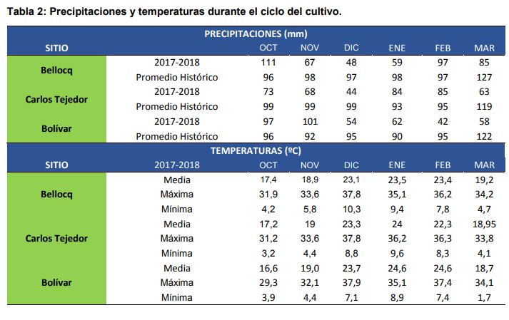 En los tres sitios se evaluaron 28 materiales comerciales. Para una mejor comprensión de los resultados en la Tabla 1 se presentan los datos técnicos de cada ensayo, y en la Tabla 2 las precipitaciones y temperaturas acontecidas durante el ciclo del cultivo. Cabe destacar que las lluvias fueron inferiores al promedio histórico en 146 mm para Bellocq, 176 mm para Bolívar y 187 mm para Carlos Tejedor.
