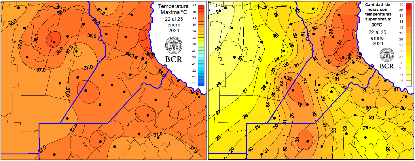 Habrá un saldo negativo sobre la disponibilidad hídrica de los cultivos. Para saber cuántos milímetros le va a costar este evento a la región se utilizaron los registros de la red de estaciones GEA de la Bolsa de comercio de Rosario y el algoritmo de HARGREAVES y SAMANI. Este algoritmo permite calcular la pérdida de agua por evapotranspiración en milímetros por día. Para los cálculos se tuvieron en cuenta los parámetros de latitud, temperaturas y radiación solar de cada punto de medición de la red.