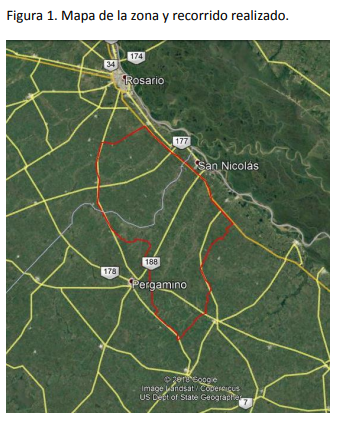 El 5 de noviembre se realizó una transecta, cuya ruta fue muy similar a la del año anterior (Prieto y Vita, 2017), con un recorrido de 305 km de distancia, involucrando 1406 lotes pertenecientes a los departamentos Constitución y Rosario de la provincia de Santa Fe, y a los partidos de Pergamino, Ramallo y San Nicolás de la provincia de Buenos Aires (Figura 1). En cada uno de los 1406 lotes adyacentes a la ruta recorrida se le midió previamente la superficie utilizando como herramienta Google Earth PRO. A partir de esa información se identificaron las diferentes especies sembradas en cada lote.