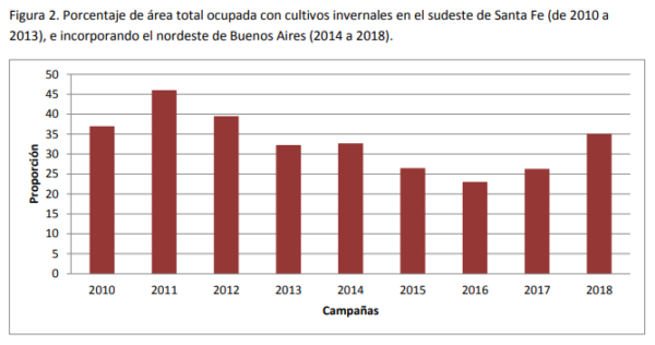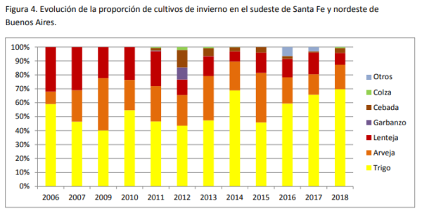 En función del total de área (suma de los distritos), se puede estimar la superficie total por cultivo. El trigo, con una amplia distribución en ambas provincias, suma 229.000 has, mientras que arveja ocupa 57.500 has. Lenteja se trató en forma diferente debido a la escasa cantidad de lotes en la provincia de Buenos Aires, extrapolándose solo sobre Santa Fe, se estimaron 27.700 has. Finalmente se muestra en la figura 4 la evolución del área de cultivos de invierno de los últimos años.
