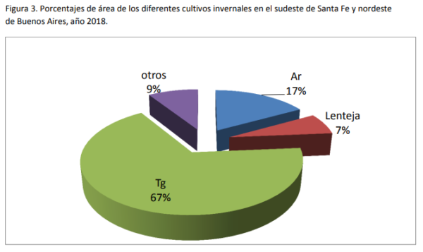 El relevamiento cubrió el 3.37 % del área total de esos distritos, determinándose además que la proporción de cultivos de invierno sobre el total disponible fue del 34.8 %, un fuerte incremento respecto del nivel de ocupación del año pasado (Figura 2). Dentro de las especies que se implantaron en el invierno, nuevamente trigo se destacó, con el 67 %, siguiendo arveja con el 17 %, y lenteja con 7 %, aunque merece un análisis especial dado que no se detectaron lotes en la provincia de Buenos Aires (Figura 3). Finalmente la suma de “Otros” que incluyen a colza, cebada, avena, etc, llegan al 9 % del total implantado en el invierno de 2018.
