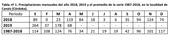La situación actual en los lotes evaluados de la zona de Canals (Córdoba) con cultivo antecesor soja (campaña 2018/19) donde se proyecta la siembra de trigo, presentan una condición hídrica excelente en los ambientes de bajo. En las lomas hasta el momento de evaluación el perfil de suelo no está completamente recargado de humedad para garantizar un piso aceptable de rendimiento. En estas situaciones, dependerá de las lluvias del mes de mayo que determinan la condición de los perfiles de humedad para la siembra de trigo.